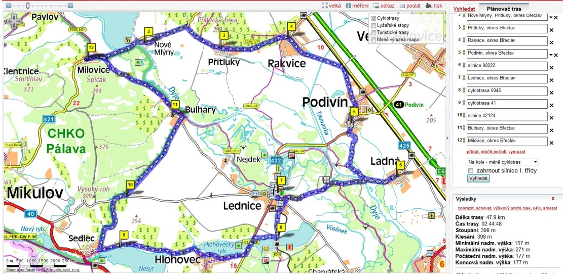 ), Perná, Horní Věstonice, Dolní Věstonice, Strachotín, Šibeniční vrch (to bylo už fakt na oprátku