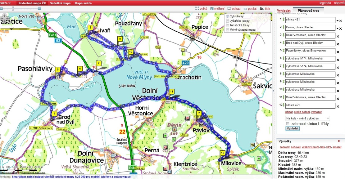 3. den → Milovice, Pavlov, Dolní Věstonice, Brod nad Dyjí, Pasohlávky, Ivaň, Dolní Věstonice, Milovice → výsledek 48km, trasa kolem 1. a 2.nádrže na mapě jednoduchá ale 2x jsme sjeli z trasy a skončili ve slepé uličce v rákosí