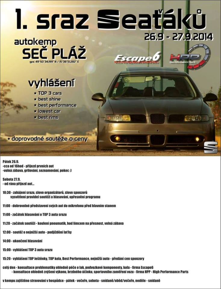 Sraz se koná od 26.9.-27.9. v autokempu Seč pláž. Zváni jsou všichni milovníci značky vozů seat. Budou různé soutěže o ceny a také vyhlášení různých kategorii vozů např. nejnižší auto srazu, nebo soutěž o nejlepší kola na sraze. Dále budou i prezentace našich sponzorů, kteří budou mít na sraze i svoje stánky ;)